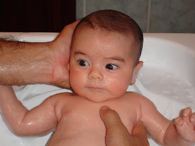 SOLUÇÃO Com o mesmo tempo, 1 mês e uma semana, o Salvador (em baixo) pesava menos 1 kilo. Já a paixão pela água mantém-se! O banho continua a ser um momento para divertir e relaxar.